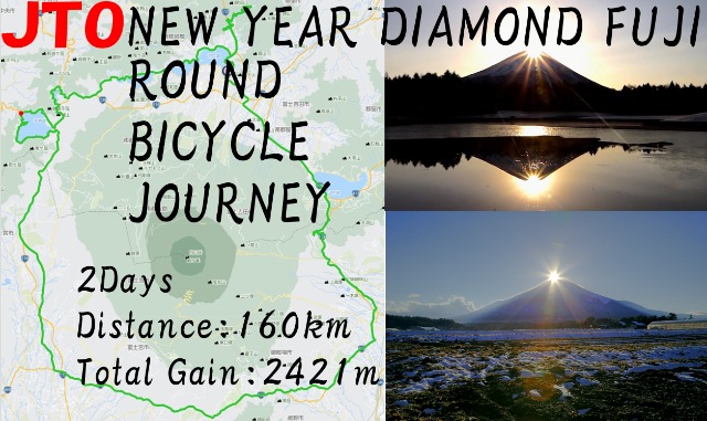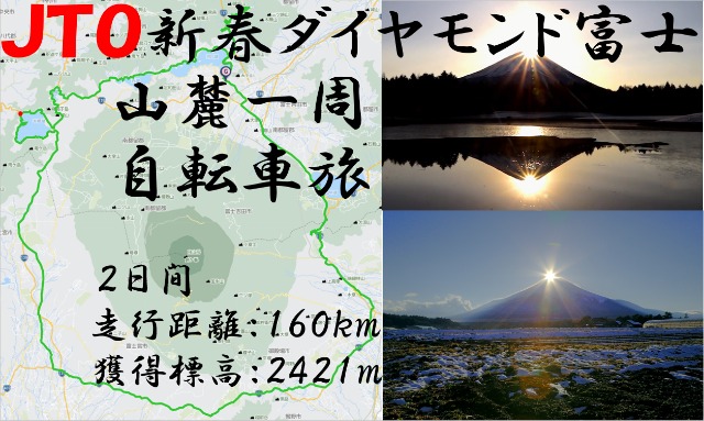 JTO新春ダイヤモンド富士 山麓一周 自転車旅 2026New year diamond Fuji bicycle journey 富士山麓一周の日出日没の絶景を巡ります。 2025年1月4日(日)~5日(月) 走行距離160km 獲得標高2421m ① 4(日) 河口湖→…